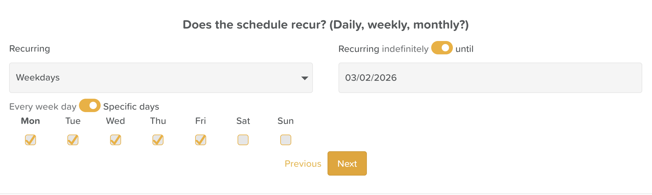 If the schedule should recur until a specific date, click the toggle Recurring Indefinitely and set the end date using the calendar selection tool.