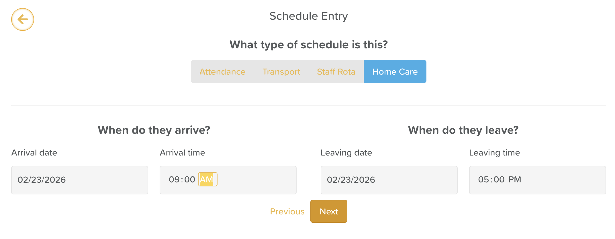 Select the leaving date and time. The arrival date and leaving date will be the same, with the exception of overnight care.