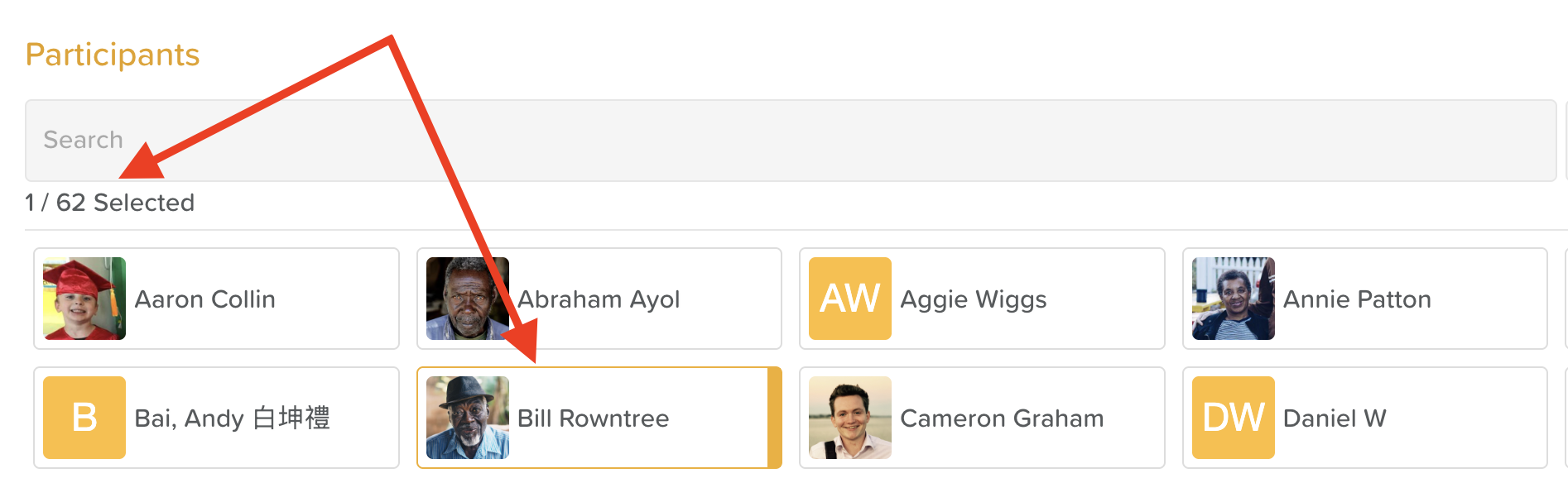 Use the search bar to find Participants by name or group tags for those already assigned to a group.