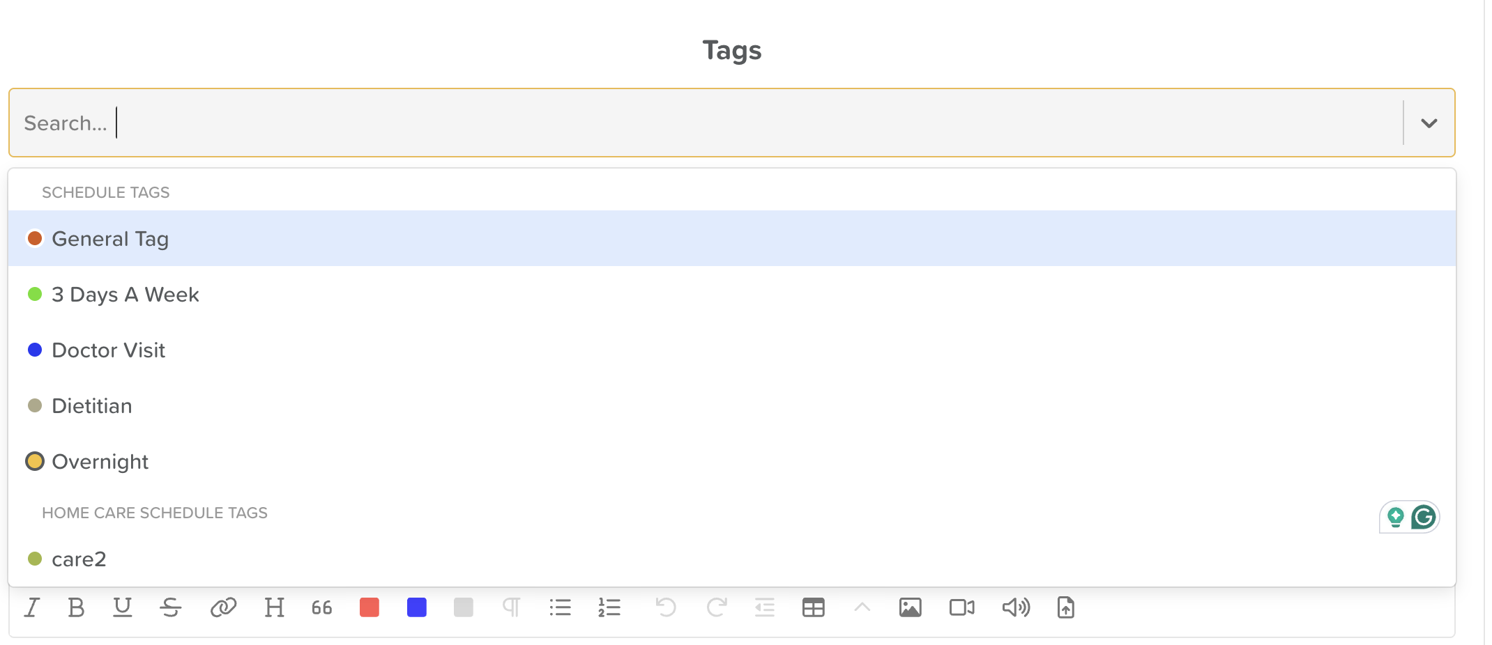 Tags are optional, but can help organize visits and display important information. When viewing the Home Care Schedule on StoriiCare, you can filter by Tags to see all participants with "2-assists" needed, for example.