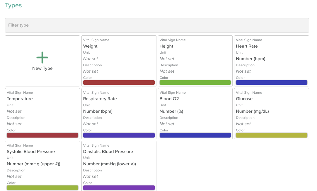 Note: Custom Vital Sign Types must be created before they can be added to a Vital Signs Group.