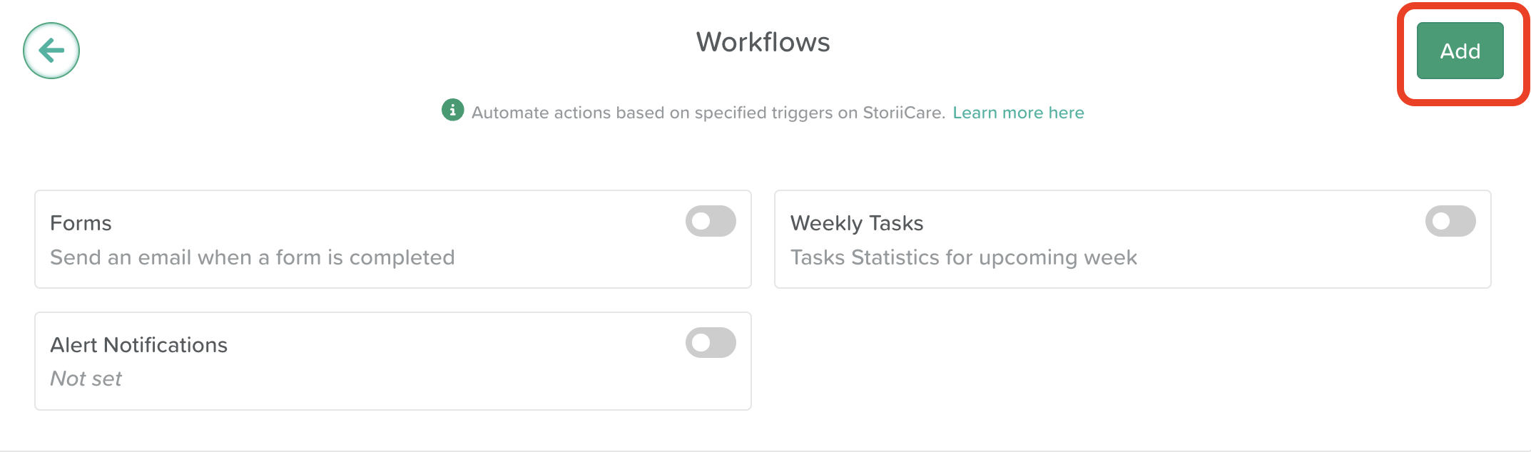 Selected staff can receive email notifications any time an alert is triggered in StoriiCare. This is configured through the Workflows feature and can be set up to notify one or multiple staff members.
