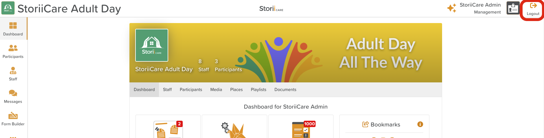 The Logout button is located in the top-right corner of the StoriiCare screen.
