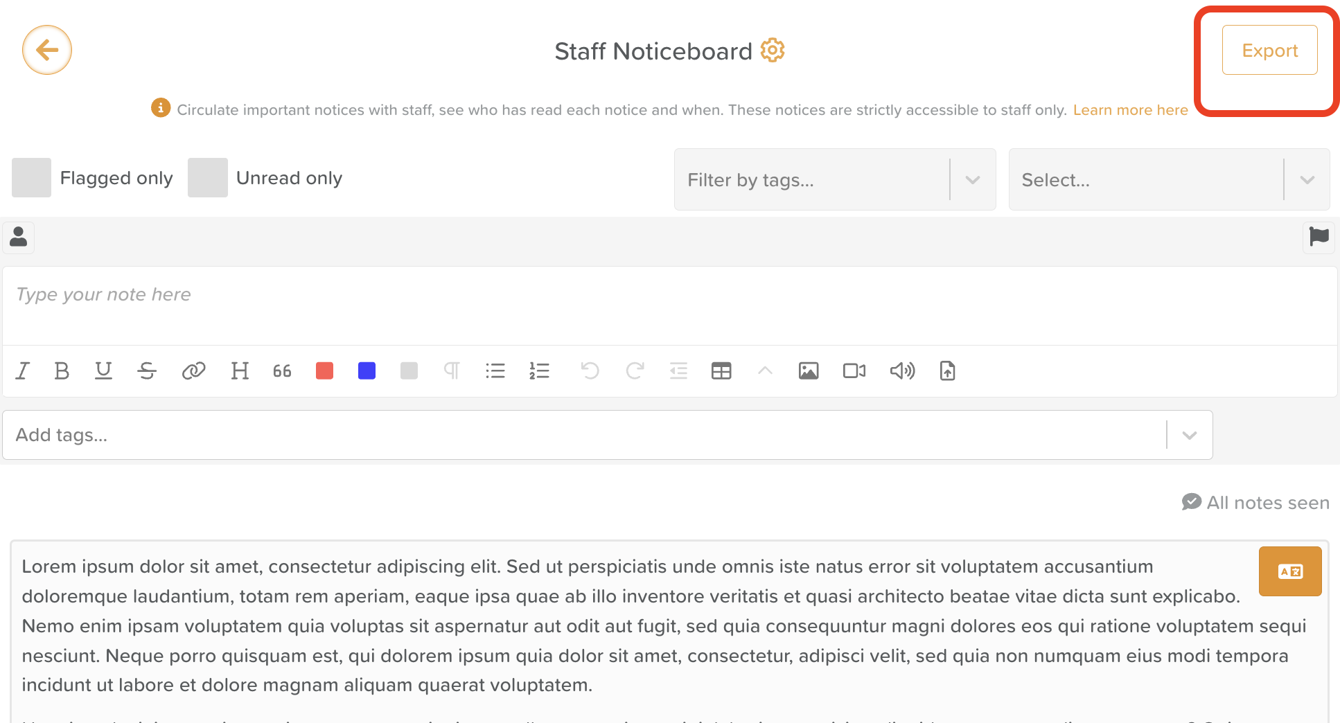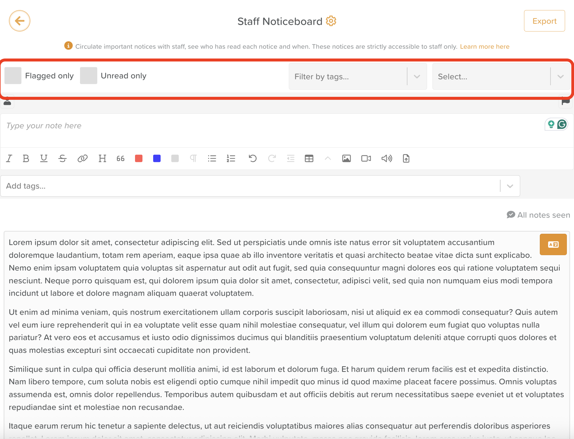 Flagged only (if enabled on your account) helps staff quickly locate any urgent notices.