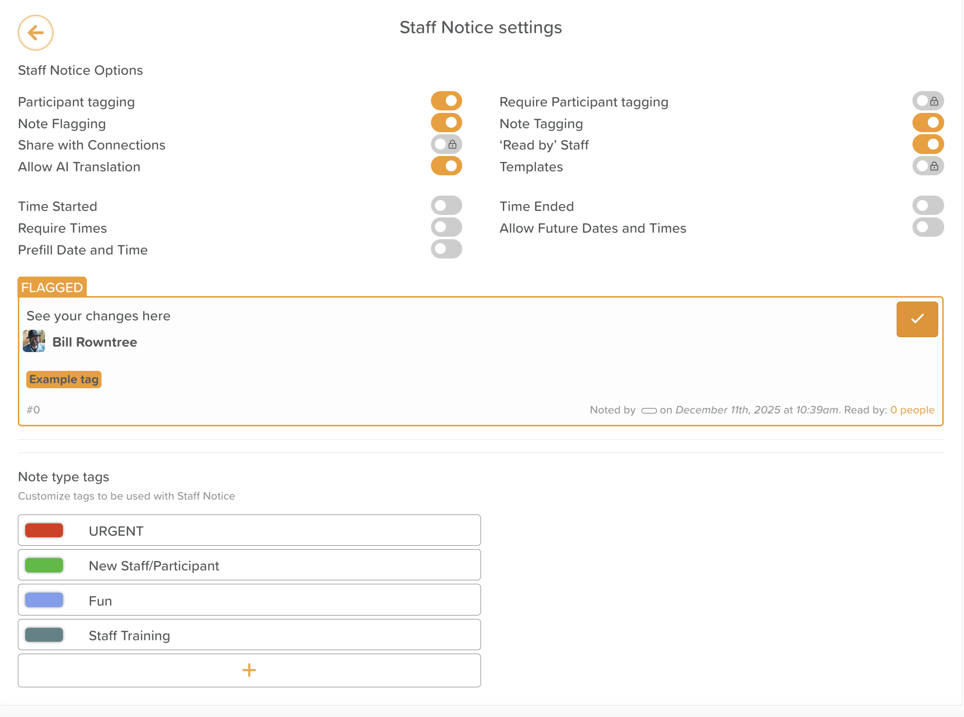 Enabling or disabling Participant Tagging. This setting is usually disabled, as Staff Notices are reserved for operational updates. However, some care providers may have a reason to tag participants in their Staff Notices.