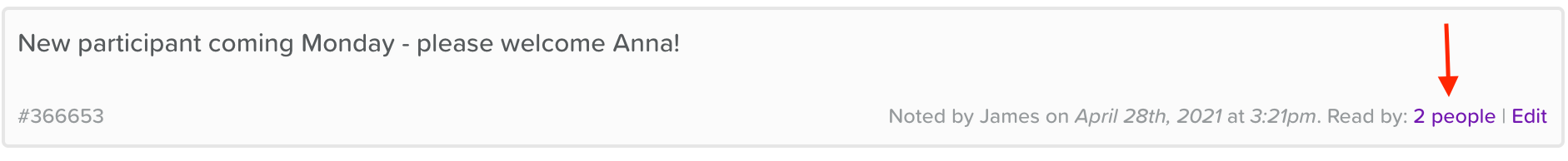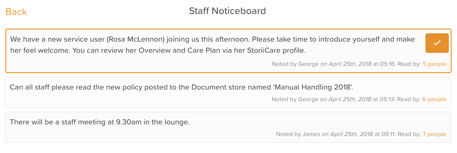 Enabling or disabling 'Read by' Staff. If enabled, each post to the noticeboard has a check mark in the right corner for staff to mark the note as read. Managers can then click where it says 'X people' to view a list of who has and hasn't read the Staff Notice.