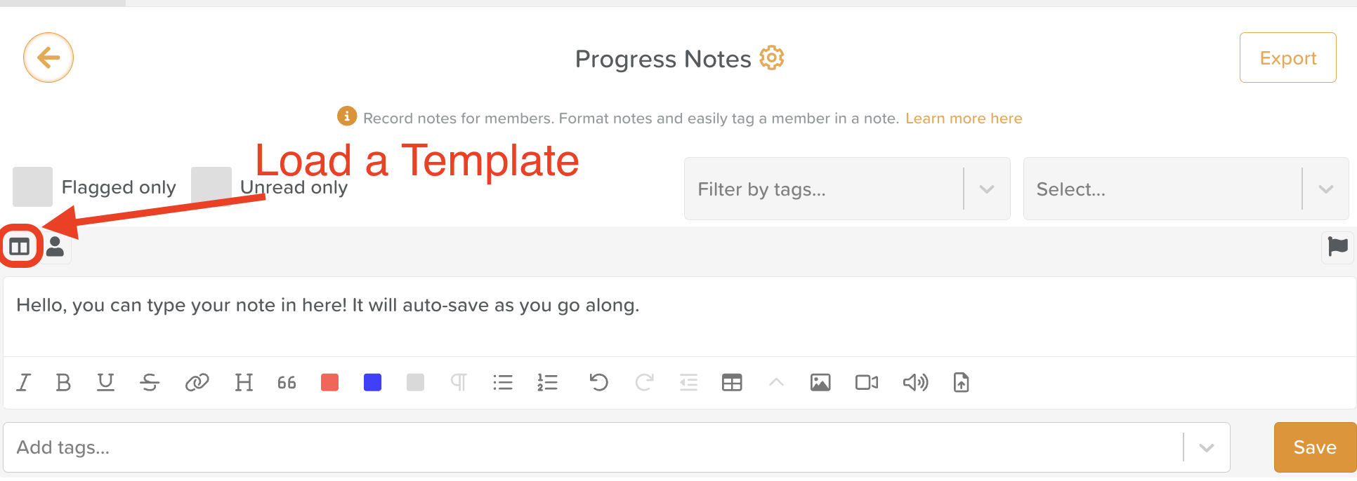 Choose whether to begin with a blank note or Load Template (templates help standardize documentation across staff).