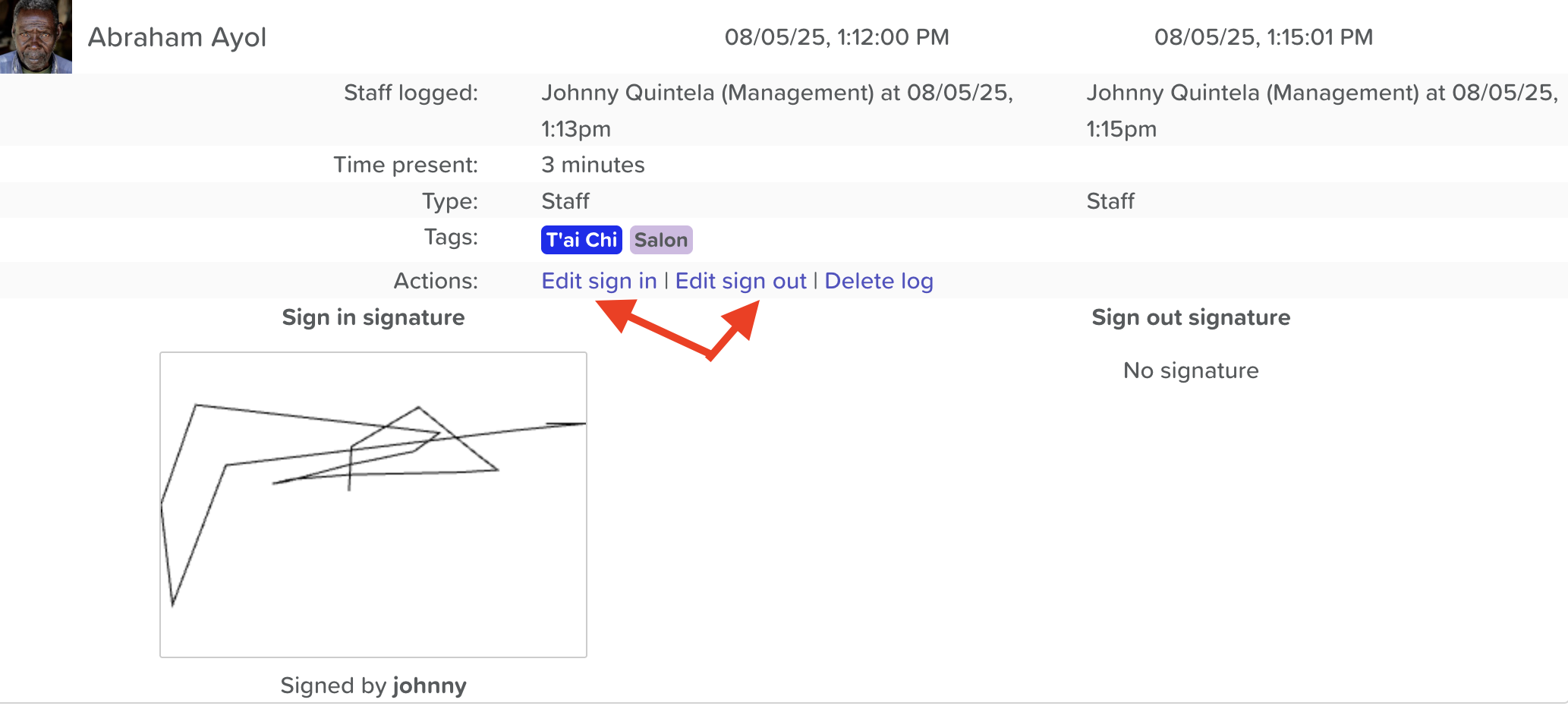 If a sign-in or sign-out time was entered incorrectly, or if you need to update tags or other details, you can edit a Register log directly in StoriiCare.