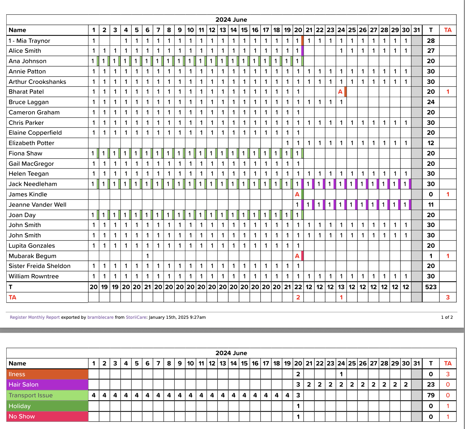 StoriiCare’s Monthly Attendance/Absence Report provides a clear, calendar-style overview of each service user’s attendance throughout a given month. This report is especially useful for tracking attendance patterns, compliance, and care billing.
