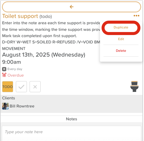 Duplicating a task is a quick way to create a new task with the same details as an existing one. This saves time when assigning similar tasks to different staff or participants!
