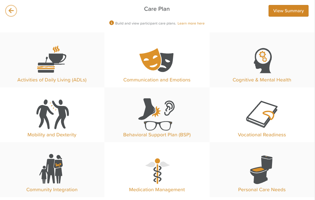 The Care Plan feature (sometimes referred to as Support Plan, Service Plan, Know Me Better, or another term — depending on your organization’s configuration) allows you to record and manage individualized plans of care for participants.