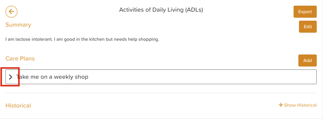 Locate the specific Care Plan and click the arrow next to it.