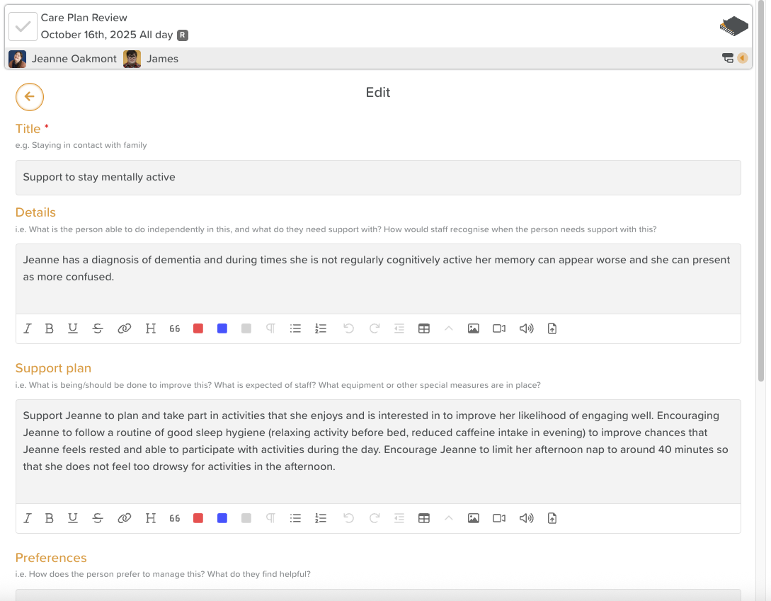 📝 Care Plan may appear as Support Plan, Service Plan, Care & Support Plan, Know Me Better, etc., depending on your organization’s terminology.
