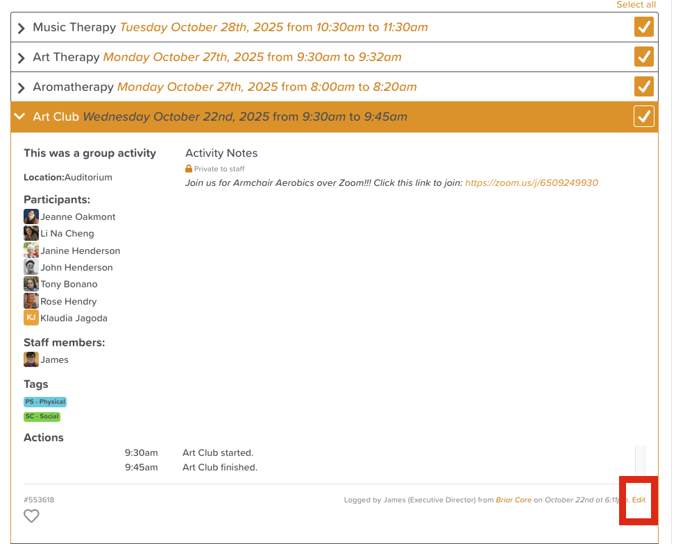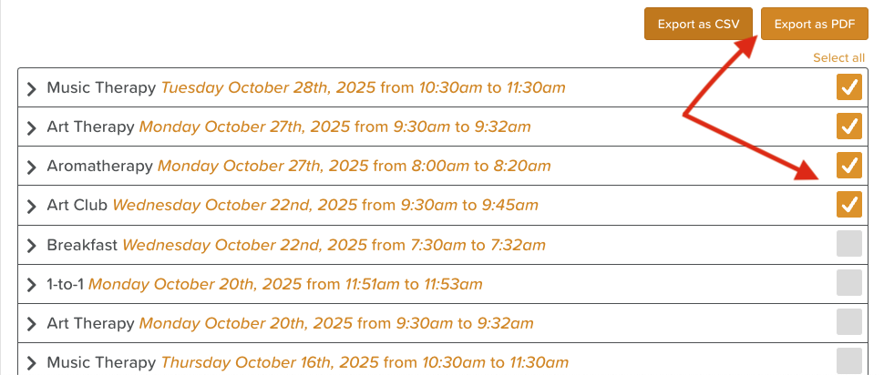 Activity Name or Type – Focus on specific activity types, such as “Breakfast,” “Exercise,” or “Arts & Crafts.”