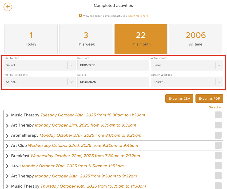 You can refine your view or create targeted reports using the filter options at the top of the Completed Activities page.