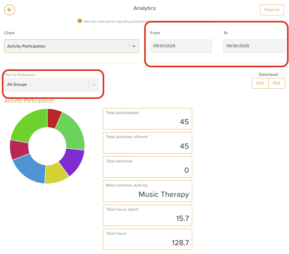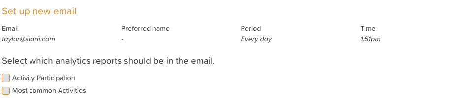Users can have Activity Participation and Most Common Activities analytics reports emailed to them at their preferred frequency.