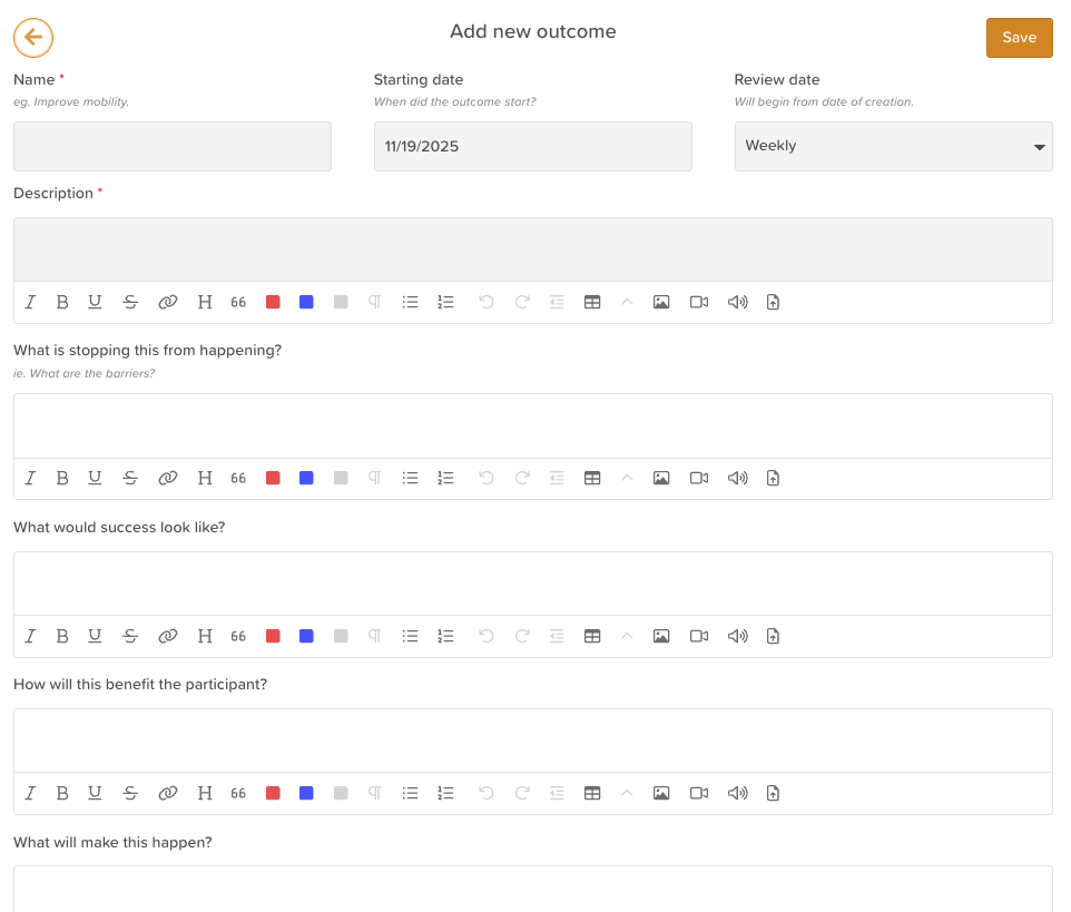 ⚠️ The Goals template cannot be customized at this time. If you require specific headings, prompts, or signatures for Goal tracking, we'd recommend using the Form Builder to create your desired Form.