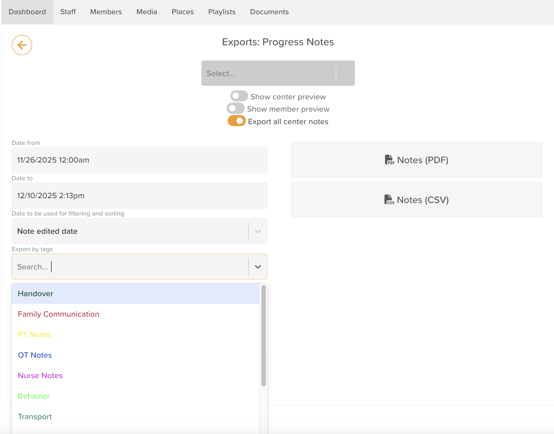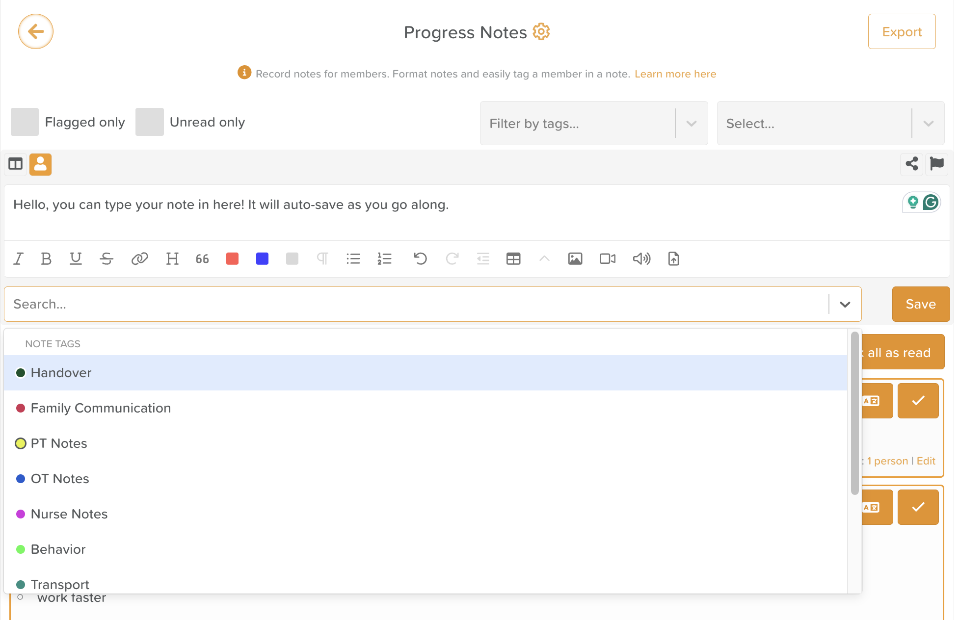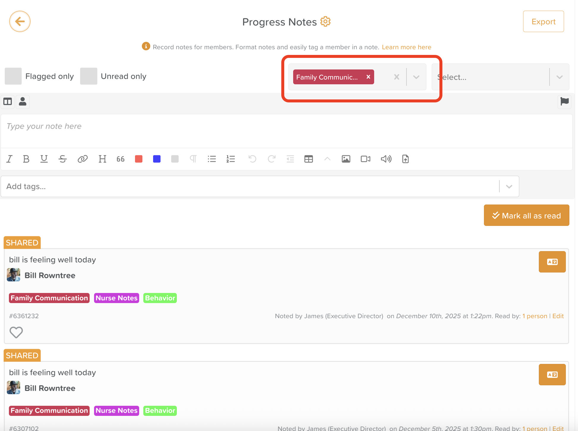 Tags allow staff to quickly filter notes and identify patterns or themes in documentation.