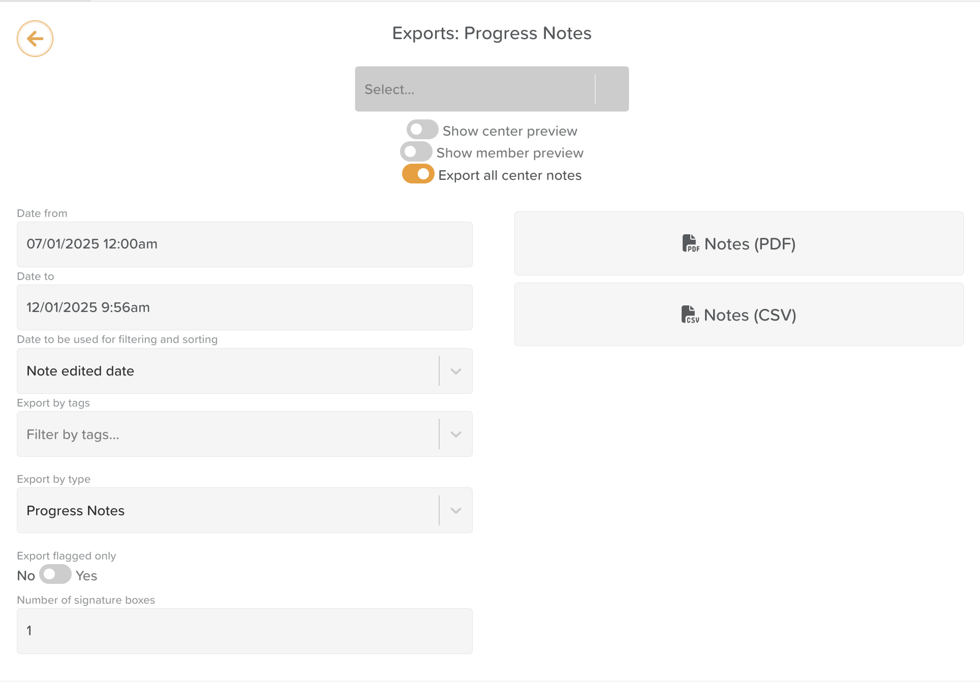For multi-person audits, use Export all center notes alongside date and tag filters.
