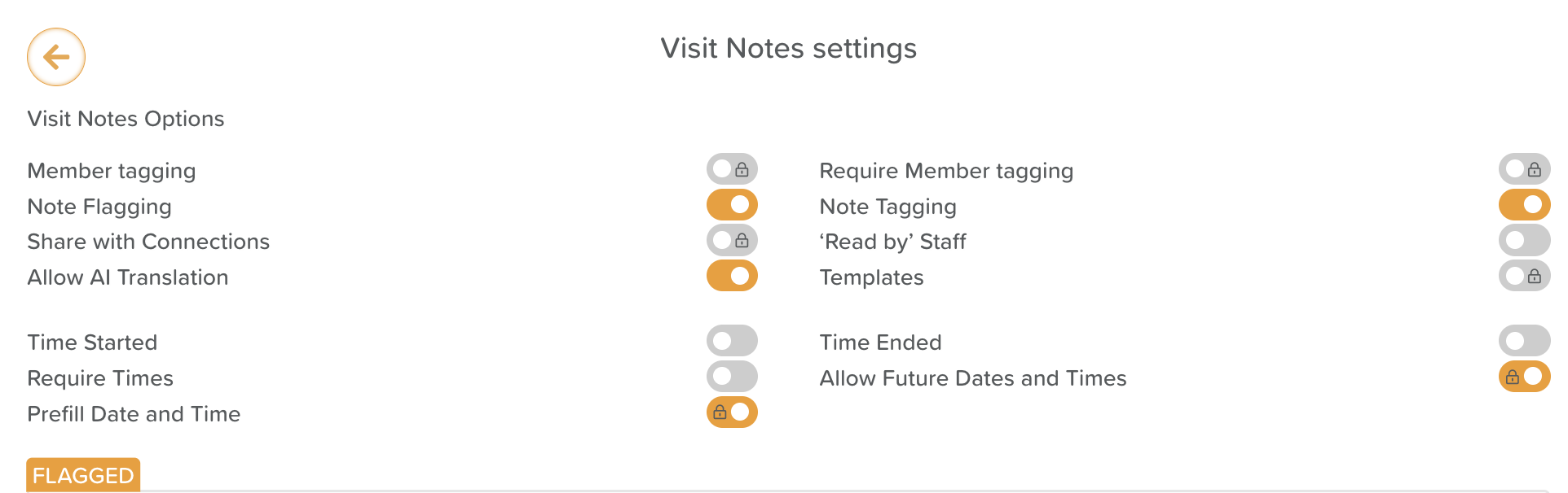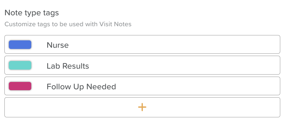The Visit Notes Settings (the title may differ on your system) area allows your organization to customize how these notes behave, what tags are available, and if start and end times are required.