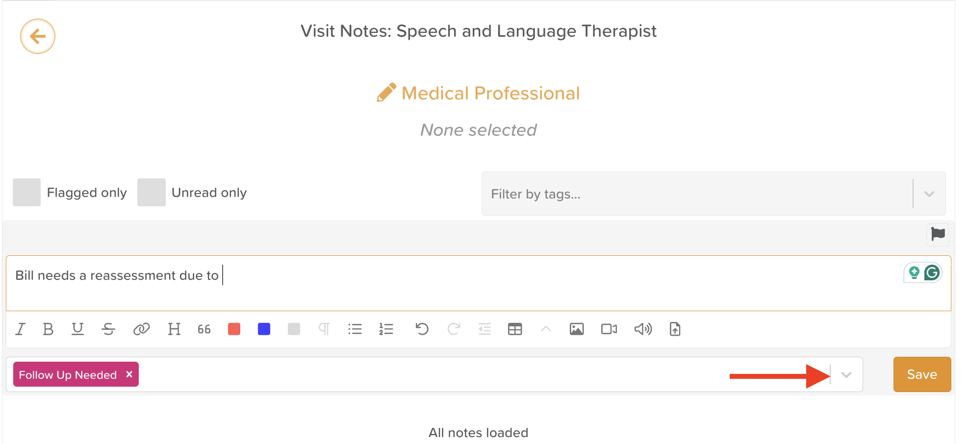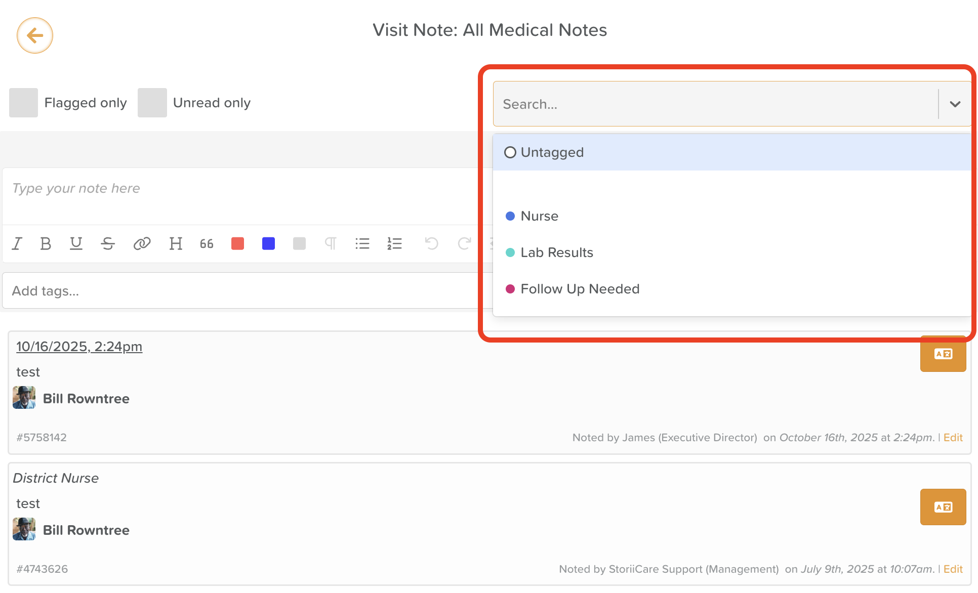 Tags allow staff to quickly filter notes and identify patterns or themes in documentation.