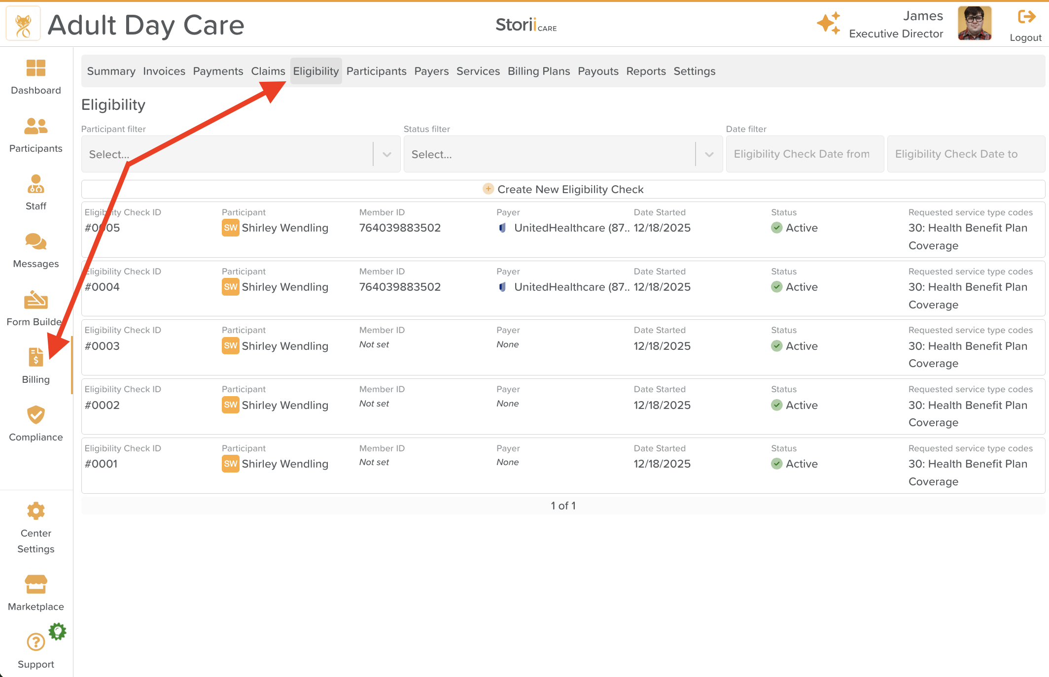 Eligibility Checks in StoriiCare help you verify a participant’s insurance coverage, benefits, and service eligibility directly from the Billing section. Eligibility now has its own dedicated tab, making it easier to manage and track checks.