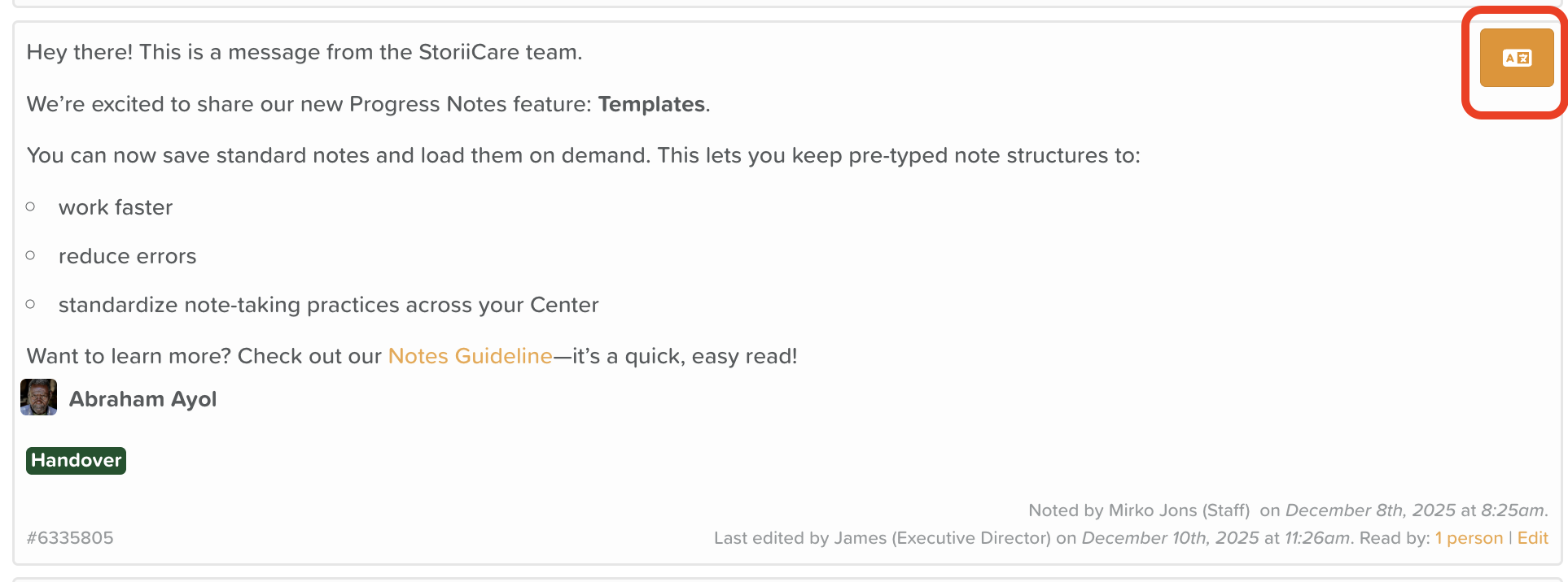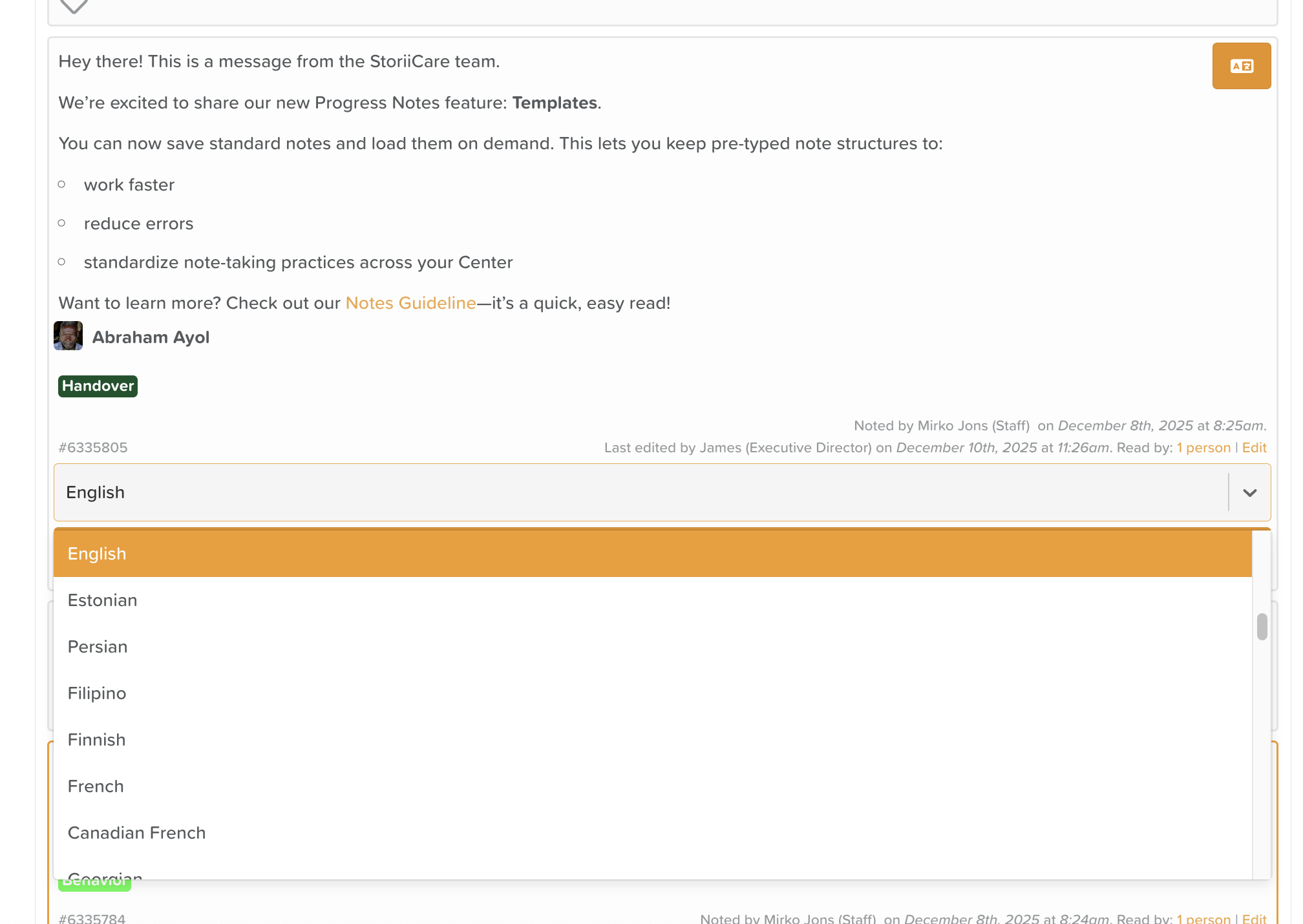 StoriiCare’s Staff Noticeboard feature includes an AI Translation tool that allows staff to quickly translate notices into different languages. This is especially useful for multilingual teams.