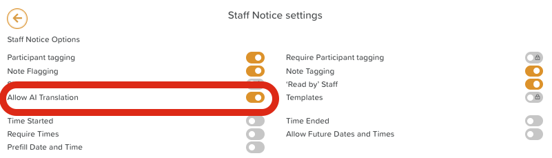 Before translation can be used, the Allow AI Translation toggle must be turned on in Progress Notes Settings.