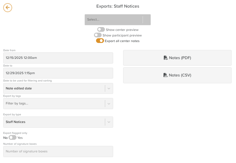 The Export Staff Notices feature allows you to download documentation for auditing and reporting. StoriiCare offers flexible filters so you can export exactly the notes you need in either PDF or CSV format.