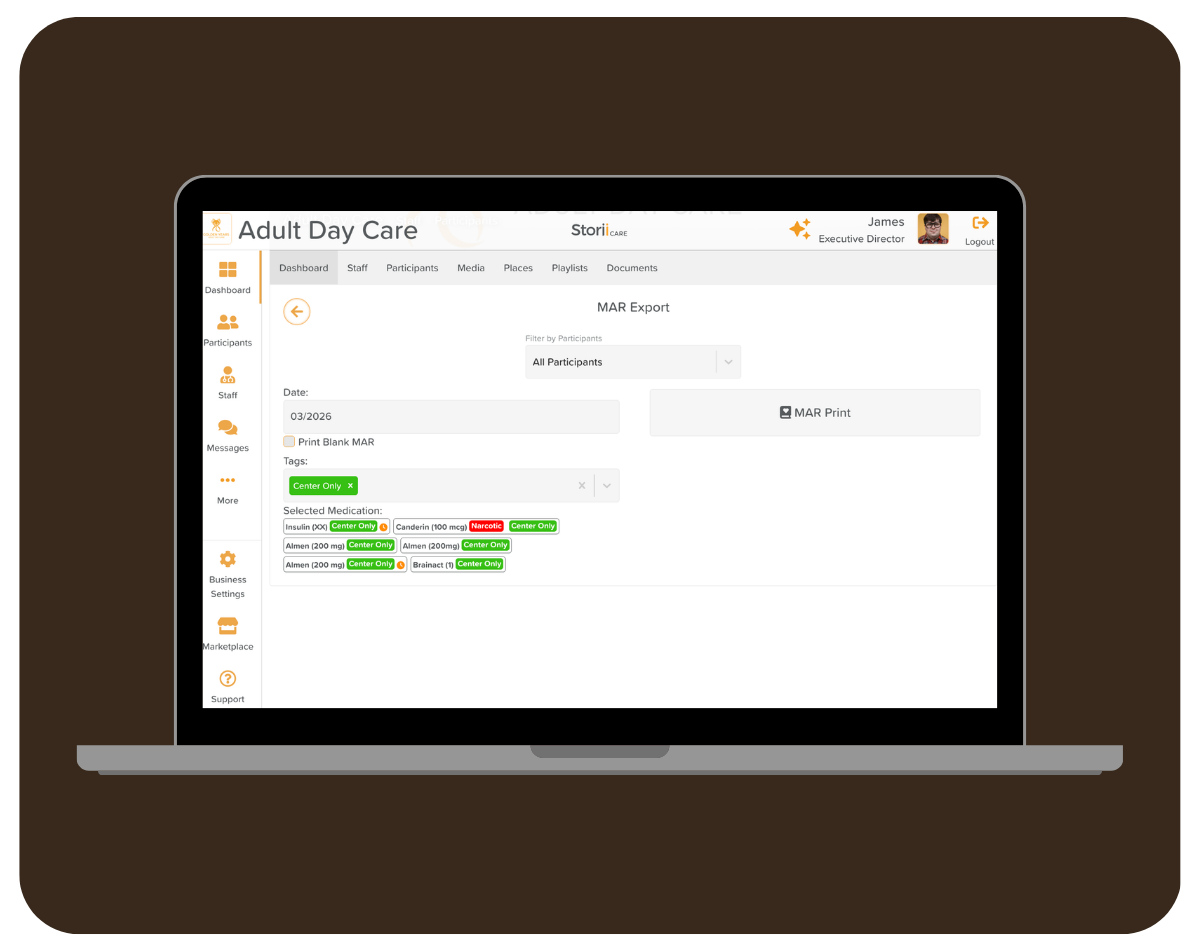 Some care centers use a “Center Only” tag to identify medications administered while the participant is onsite. By selecting this tag during export, the printed MAR will only include those medications.